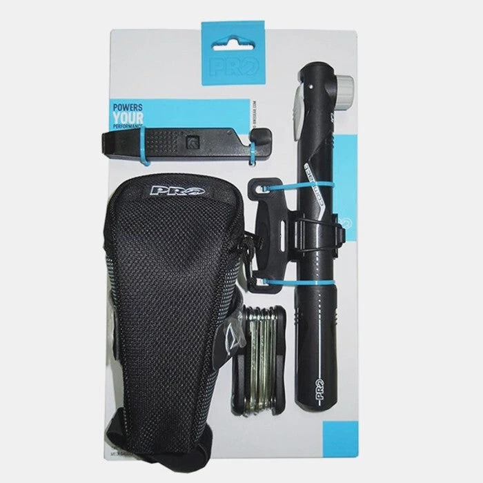 The Shimano PRO Medium Saddle Bag Combi-Pack includes the PRO Medi Saddle Bag, the PRO Compact Mini Pump, a 3-piece Tire Lever Set and a PRO 10 Function Mini Tool.