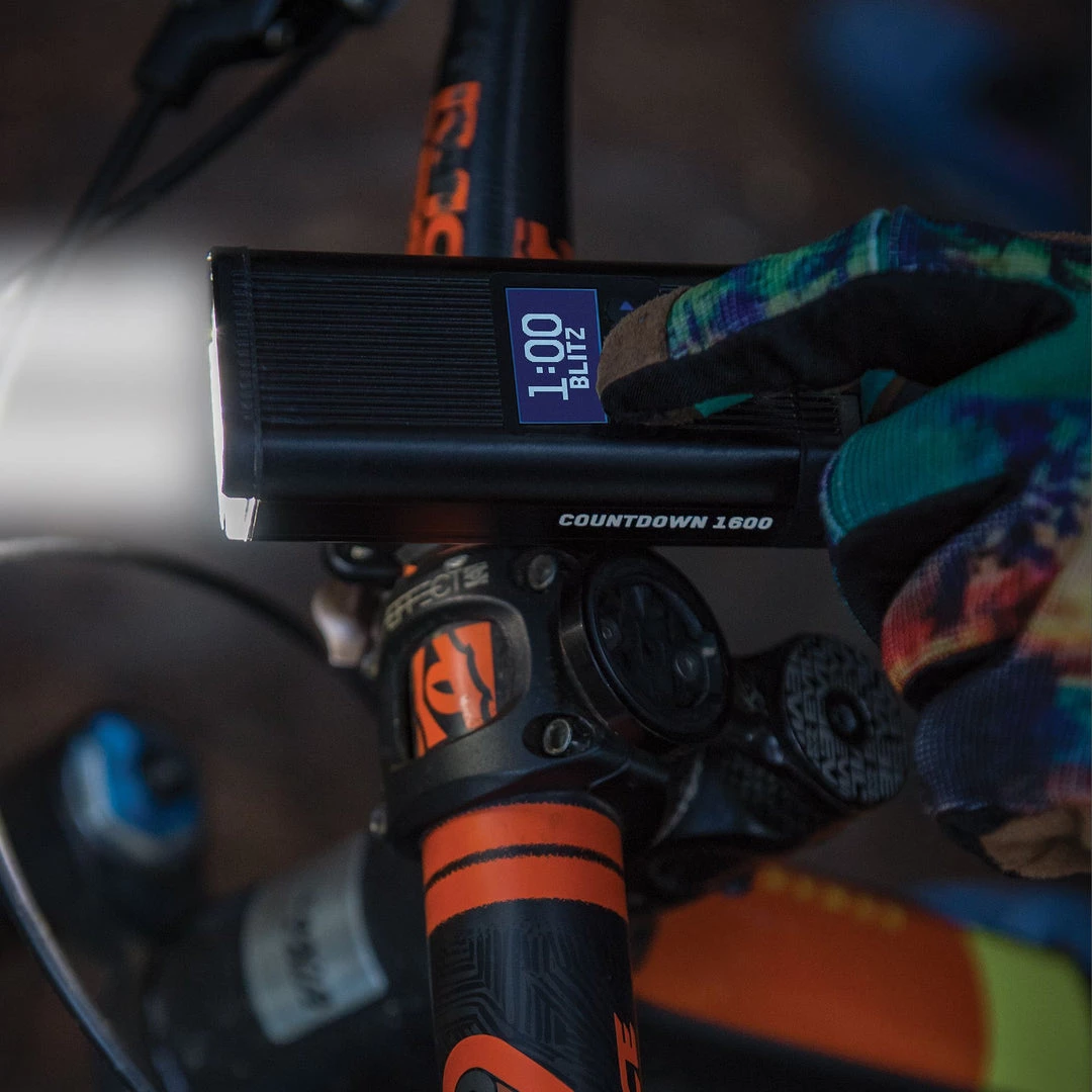 Mountain biking at night can be a magical experience that transforms your familiar trails into an entirely different world. The Blackburn Countdown 1600 front bike light has an easy to read backlit digital display that tells you exactly how many minutes of light remains in each of the 6 power modes.