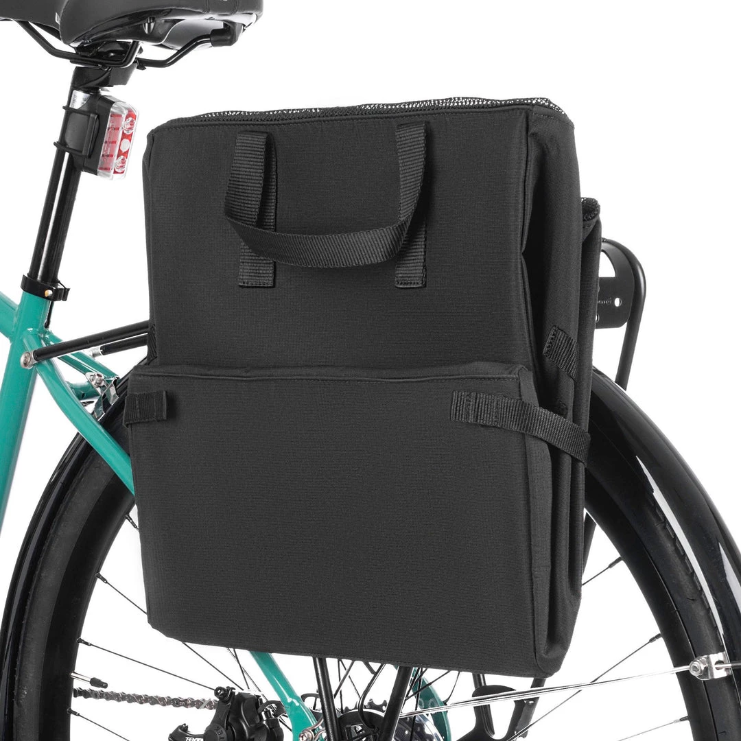 - Mounting Options – Rack-mounted pannier with rubber-coated hooks and bungee attachment