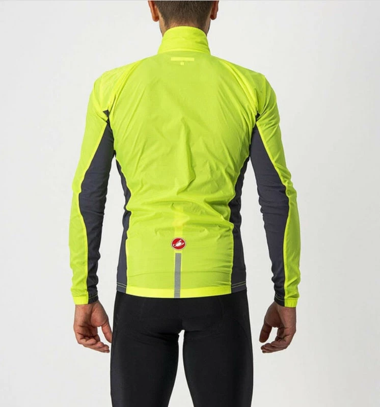 The Castelli Squadra Stretch cycling jacket is the modern interpretation of the wind shell jacket, the one you keep in your pocket for a long descent or put on for the first hour of the ride until the day warms up. That jacket used to be a simple affair — a nylon shell — but the lack of stretch meant that it had to be cut on the generous side to fit all body shapes, both on and off the bike. Castelli completely reimagined what the shell jacket should be and how it’s constructed. Castelli added panels on the sides and the sleeves in a very high-stretch yet tightly knit fabric that allows us to give the jacket a modern, close-to-body fit for aero gains on any terrain, and it actually keeps more heat in than a jacket that’s flapping about. We’ve kept it very compact so that it can pack away into minimal space in a jersey pocket.The stretch panels are treated for water repellency, which will help in a light mist, but this is not meant to be a true rain jacket.