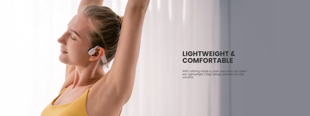 - Open-Ear Comfort – Inspired by athletes, designed for everyone. Our open-ear design powered by bone conduction technology allows for total awareness of surroundings and bud-free, comfortable listening.