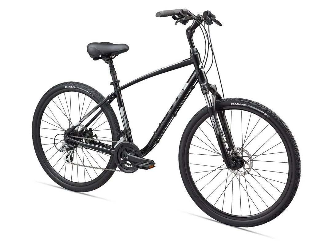Smooth-rolling 700c wheels give the Giant Cypress DX Disc Hybrid bike a comfortable ride, even when things get a little bumpy. The suspension seatpost soaks up shocks, and the ALUXX aluminum frame provides a comfortable, upright ride. You can take it on roads or bike paths, even some dirt. Just keep pedaling and enjoy the ride.