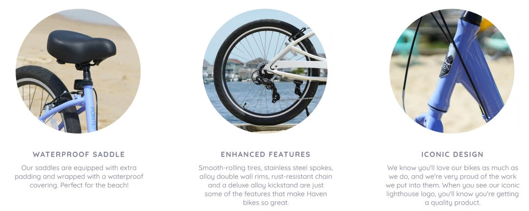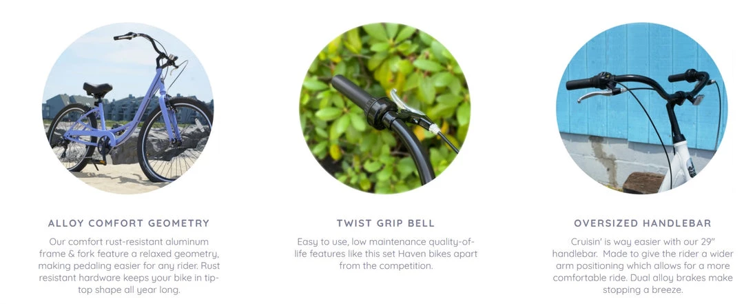 There’s no hill you can’t conquer with the Haven Pointe 7 and its 7-speed drivetrain. The smooth & intuitive twist shifters of the Haven Pointe 7 will have you switching between gears with style and grace, and Haven’s lightweight aluminum relaxed geometry frame design will keep you comfortably positioned during your ride. There’s a lot of bang for your buck with this comfort bike!