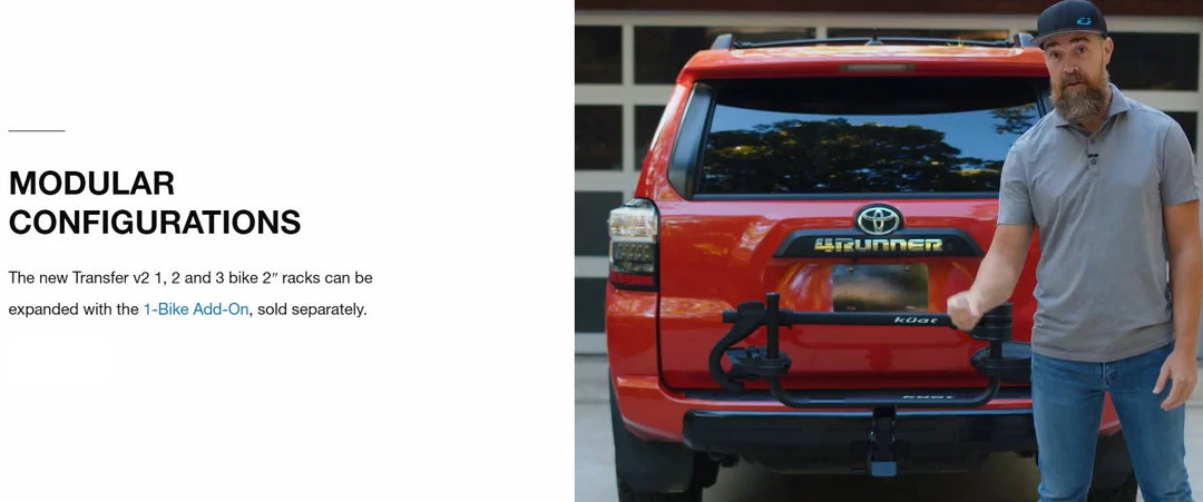The Kuat Transfer v2 2-Bike Car Hitch Rack is more solid than ever. From the steel construction of the original to a new Flatlock hitch cam for enhanced stability in tow. Plus, a semi-integrated cable lock for an upgrade in security. The best part? The new Kuat Transfer v2 has the modular configurations available so you get a multi-rider rack at an everyone-friendly price.