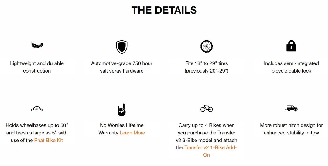 Holds up to a 50″ wheelbase bike (previously 47″)