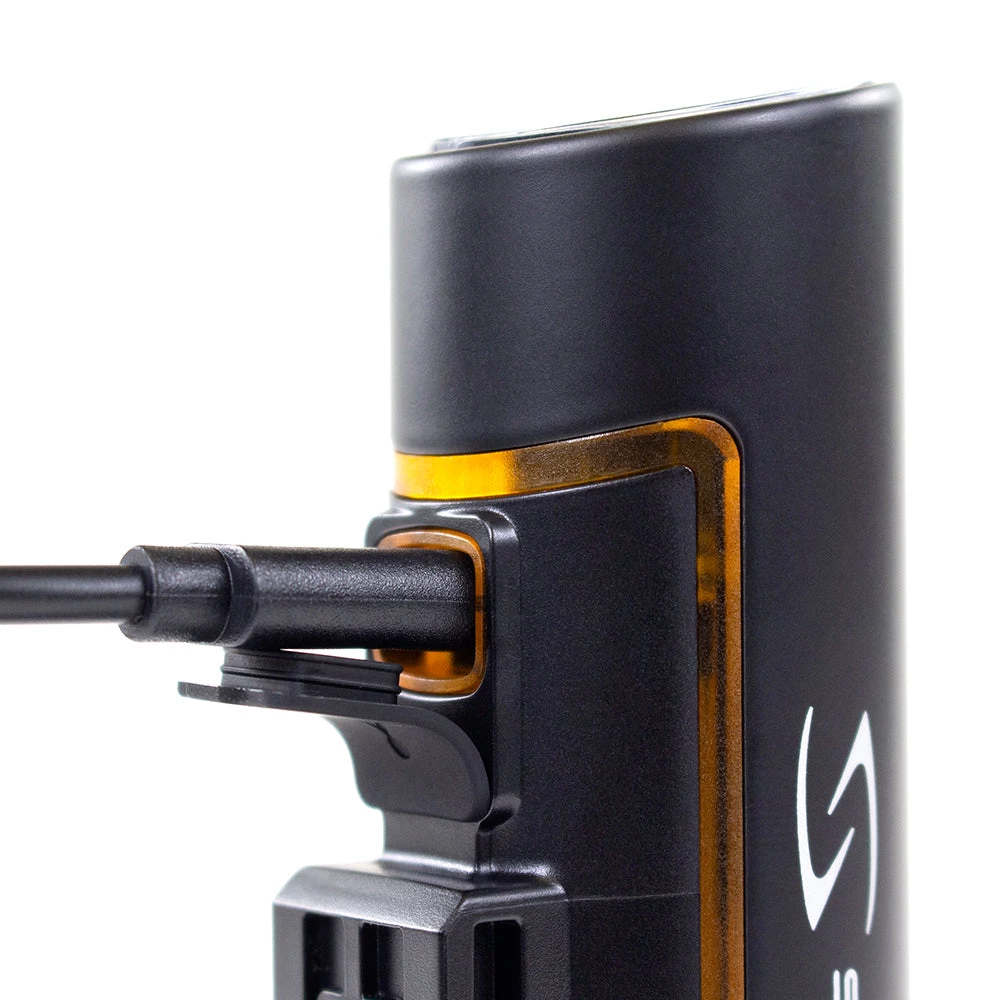 To ensure stable charging make sure the USB-C male connection is fully and firmly pressed into place in the USB-C female charge receptacle, an audible *click* will not always be heard. The integrated headlight battery charge level indicator will display five solidly illuminated blue LED dots when full charge is achieved.
