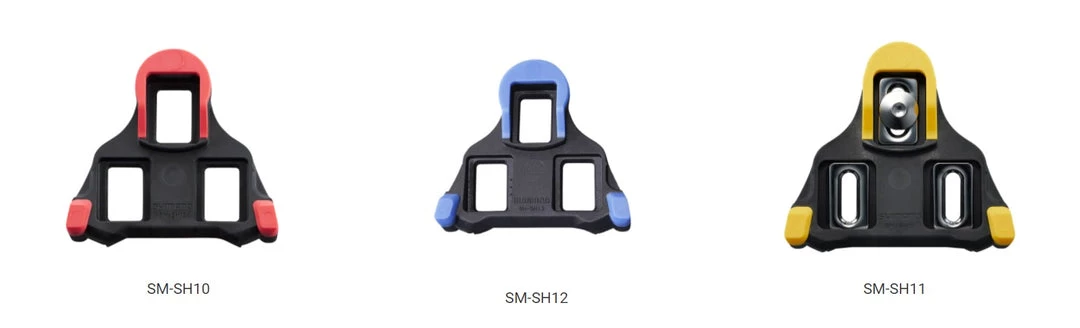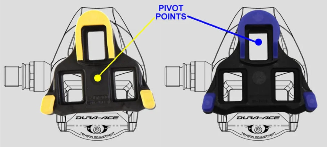 Blue SPD-SL cleats are Shimano’s newest cleat option and they exist as a middle-ground between yellow and red. Blue cleats have two degrees of float (one degree in each direction), allowing for a small range of movement while still delivering a high amount of pedaling efficiency. The float pivot point is at the front of the cleat, which eliminates lateral sliding movement while allowing a small amount of angle change from the pivot point back towards the heel.Â