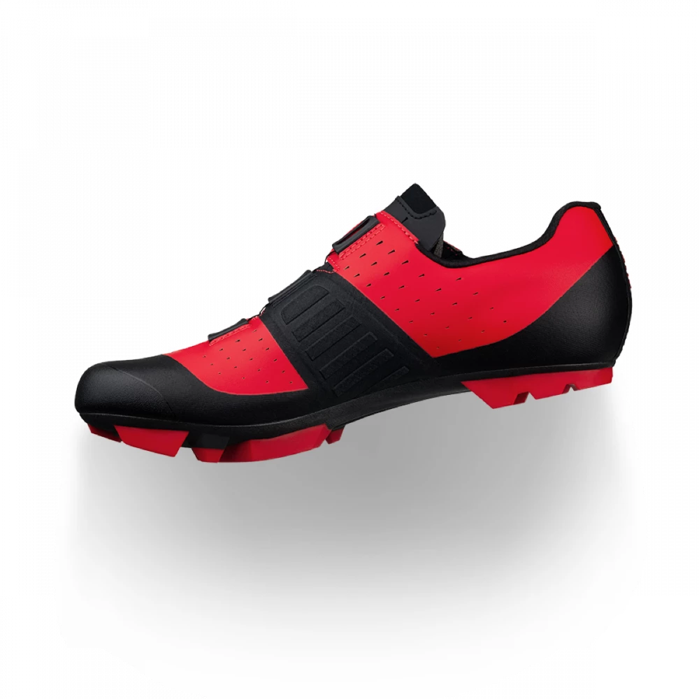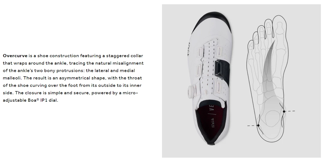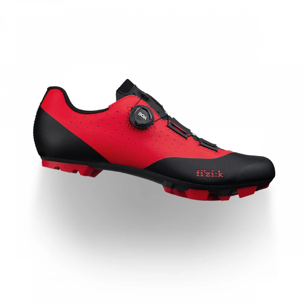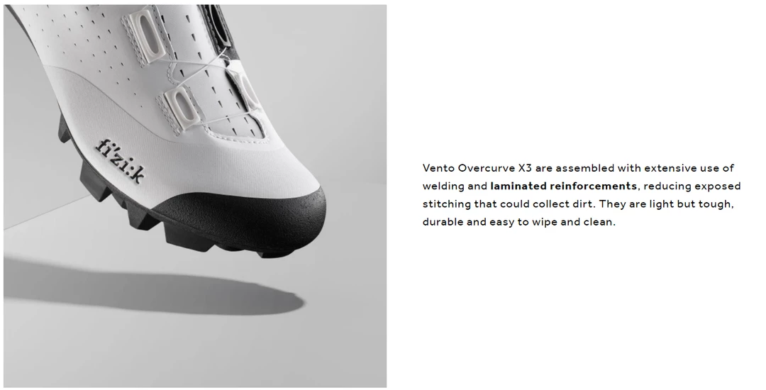The Fizik Vento Overcurve X3 Mountain Bike shoe is an XC cycling shoe with an asymmetrical construction that ergonomically conforms to the foot’s anatomy (Overcurve), a microtex upper and a X3 outsole with a durable TPU tread.  The Microtex upper of the Fizik Vento Overcurve X3 is supple yet strong and stable for a comfortable and consistent fit. It is assembled in a sleek and streamlined yet highly ergonomic pattern, offering you the protection you need. The Overcurve of the Fizik Vento Overcurve X3 is a shoe construction featuring a staggered collar that wraps around the ankle, tracing the natural misalignment of the ankle’s two bony protrusions: the lateral and medial malleoli. The result is an asymmetrical shape, with the throat of the shoe curving over the foot from its outside to its inner side. The closure is simple and secure, powered by a micro-adjustable Boa® IP1 dial.