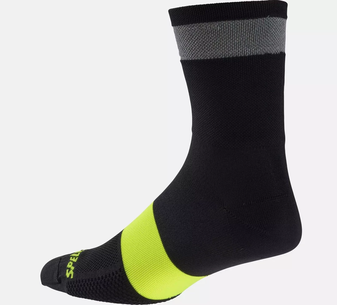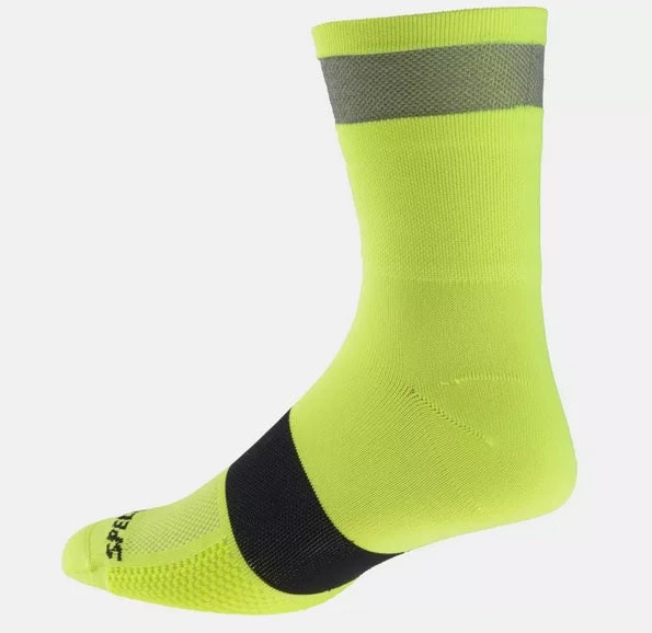The Specialized Reflect Tall cycling sock is the perfect hit of color and reflectivity to keep you visible in the day or night. Specialized takes their Specialized Reflect Road Tall sock construction, buttery soft and compressive, and add reflective yarns to the top edge. Made up of millions of glass beads that receive and reflect light back to the source, the reflective band of the Specialized Reflect Tall sock gives you an active, moving element to make yourself visable to drivers. Tall height.