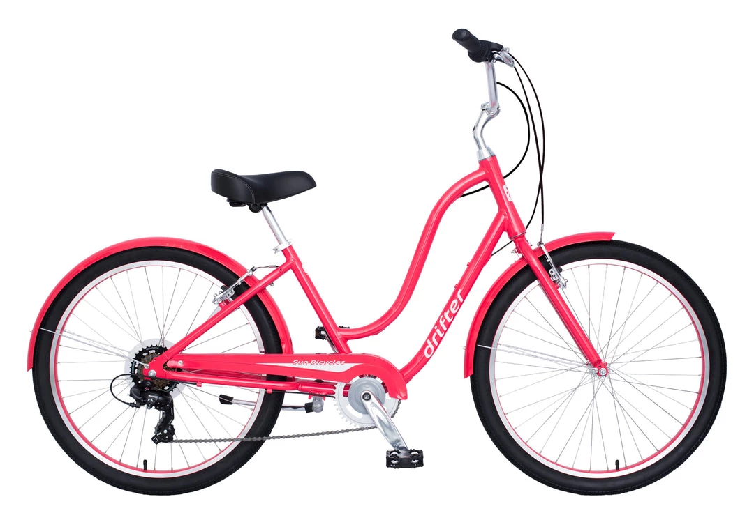 The Sun Drifter 7 Speed Step-Thru Cruiser Bike is the ideal choice for casual rides around the neighborhood, bike path, or wherever your adventure awaits. Sun’s unique Foot Forward pedal placement and easy upright riding position ensure total comfort and stability while riding your Sun Drifter 7 Speed Step-Thru Cruiser Bike. The Foot Forward position allows you to maintain proper saddle height while still having the ability to place your feet on the ground when seated. The Sun Drifter is offered in single-speed, 3-speed internal, 7-speed, and 21-speed versions to accommodate all riders.